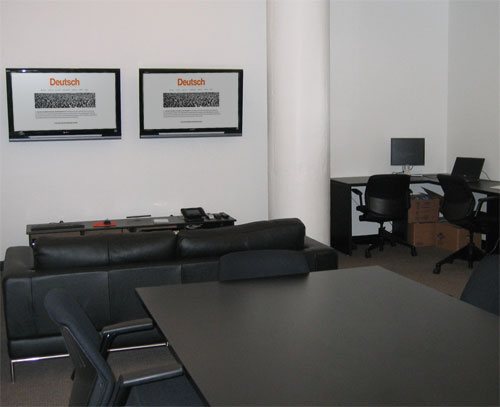 Monolith then moved on to Deutsch's Large Conference Room to tackle the projection system. We replaced their large, overpriced projector and mirror system with a new Hitachi 5000 lumens projector. We improved the image while providing a cost effective alternative to the $2500/yr. Deutsch was spending on projector lamp changes. Our renovation continued by removing "extraneous" equipment originally specified to improve the image. This equipment only functioned to do the opposite. The resulting system offers a greatly improved image, with more reliability than the previous installation.